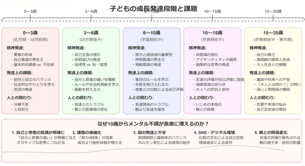 10代の子どもたちは、人生で最も劇的な変化を遂げる時期にいます。身体的な変化はもちろん、精神面でも「自分は何者なのか」「将来何になりたいのか」という根本的な問いと向き合っています。エリクソンの発達理論でいう「自我同一性vs役割混乱」の段階ですね。